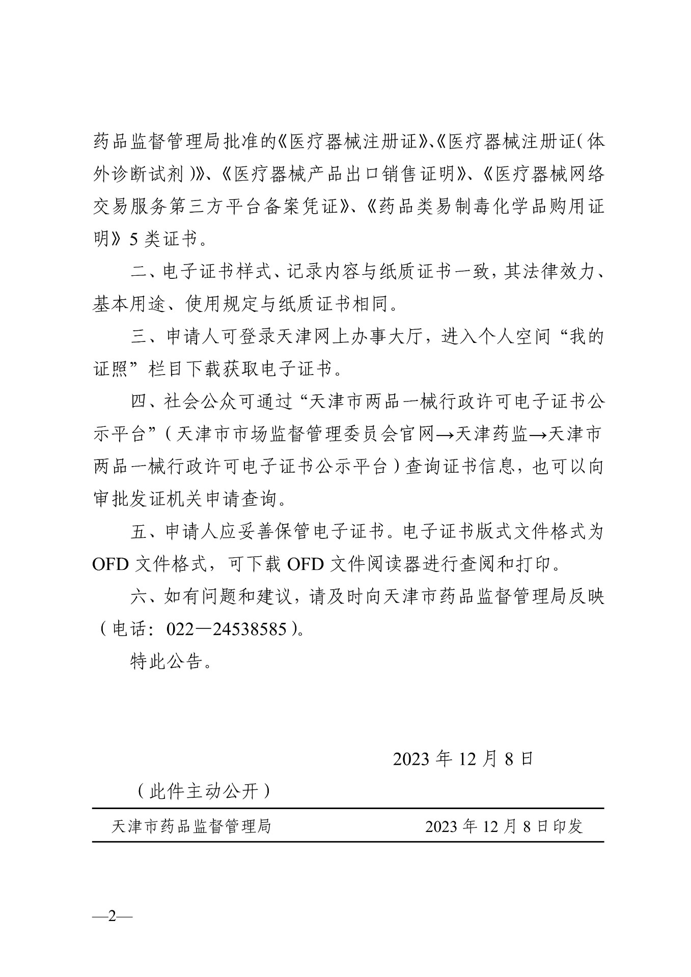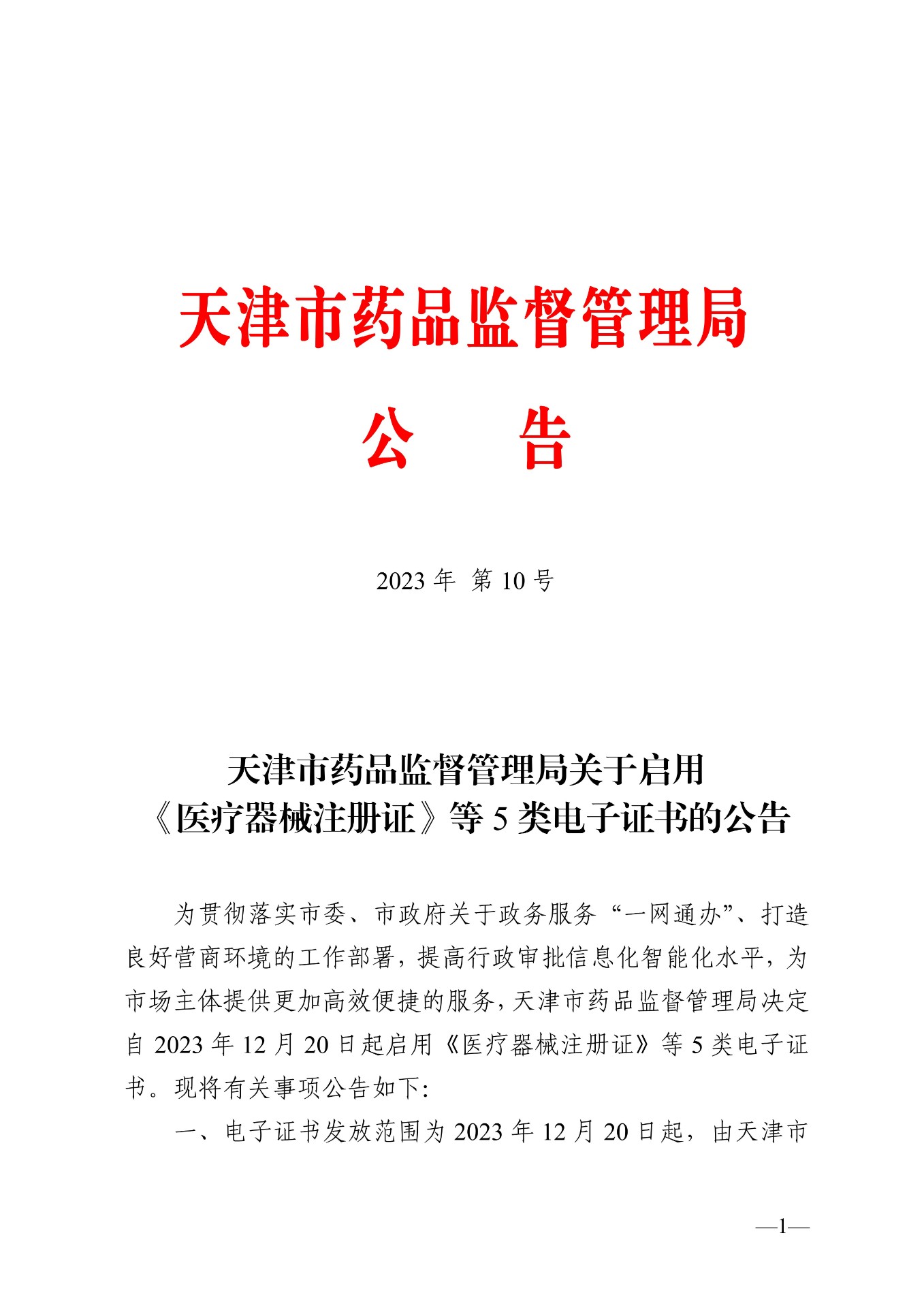 天津市药品监督管理局关于启用《医疗器械注册证》等5类电子证书的公告